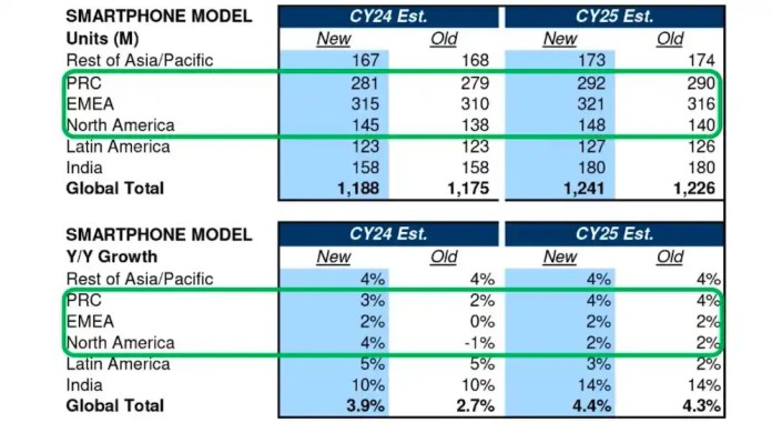 Според оценките на Goldman Sachs глобалните продажби на смартфони през 2023 г. ще намалеят с 5% на годишна база до 1,148 млрд. броя. Спадът на продажбите продължава за втора поредна година, макар и с много по-нисък темп, отколкото през 2022 г. Ръстът на продажбите ще се възобнови през 2024 г. и 2025 г., подхранван от излизането на нови продукти. Goldman Sachs прогнозира, че световните доставки на смартфони ще нараснат с 3% до 1,186 млрд. броя през 2024 г. и с още 5% до 1,209 млрд. броя през 2025 г. Според експертите „до 2025 г. световните доставки на смартфони постепенно ще се върнат на нивата от 2022 г.“.