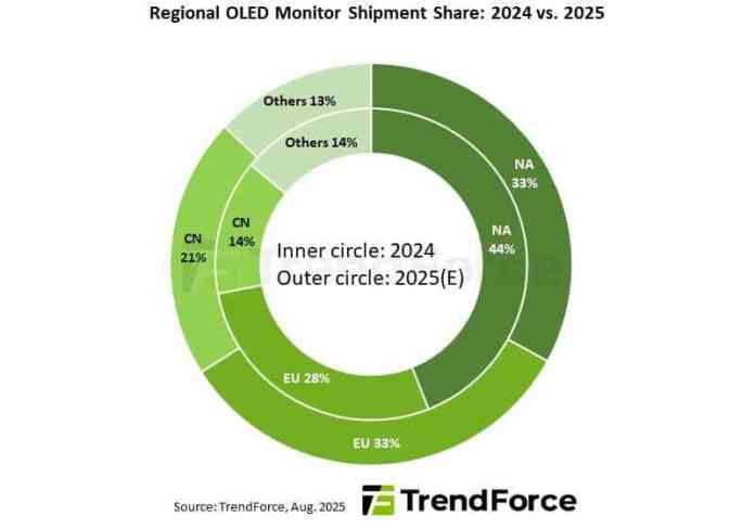 Тази година обаче, заради митата на Тръмп и стремежа към диверсификация, фокусът може да се измести към Европа и Китай, а делът на Северна Америка да спадне до 33%. Делът на Европа може да нарасне до същата цифра до края на годината, въпреки че през миналата той е бил 28%. В Китай се наблюдава силно търсене на оборудване за игри, а местните интернет кафенета преминават към монитори с усъвършенствани функции – това създава значителен потенциал за растеж на OLED сегмента. През 2024 година делът на Китай на пазара на OLED монитори е бил 14%, а до края на таиз година той може да достигне 21%, предполага TrendForce.