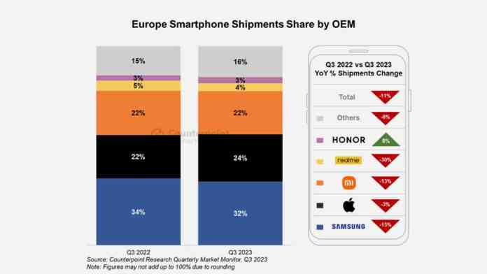 Европейският пазар на смартфоните се сви с 11% през третото тримесечие на 2023 г. Realme загуби най-много, продажбите на Apple iPhone паднаха съвсем леко и изпревариха Xiaomi, но само Honor отчита ръст.