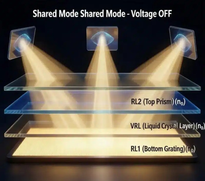 Когато функцията за “конфиденциален екран“ е активирана, към различните слоеве на дисплея се подава напрежение. Най-долният слой демонстрира дифракционна структура във вид на микроскопична решетка, гравирана на повърхността му. Тази решетка действа като щорите на прозорец. Светлинните лъчи, които се опитват да се разпространяват под широки ъгли (всяка траектория, която се отклонява от права линия), се дифрактират и пътищата им се променят в сравнение с първоначалните.