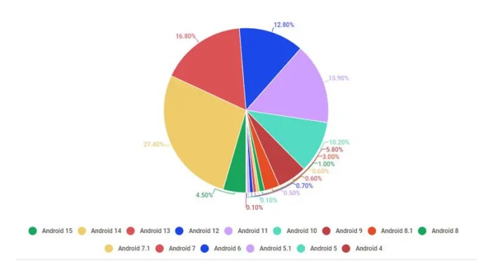 През юли 2024 г. Android 14 заемаше около 13% от пазара, но оттогава делът му значително нарасна. Това се дължи на забавеното излизане на Android 15 и бавното разпространение на актуализацията до съществуващите устройства. За сравнение, Android 13 и по-старите версии все още имат значителен пазарен дял.