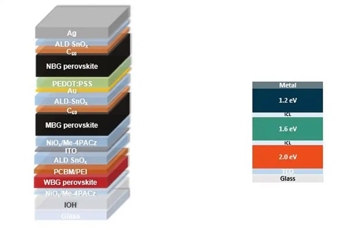 Устройството се състои от стъклена основа и множество слоеве. Това са прозрачен заден контакт, изработен от легиран с водород индиев оксид, слоеве за пренос на дупки, изработени от никелов оксид, три абсорбера с различна ширина на забранената зона, буферни слоеве, изработени от калаен оксид, и метални контакти на базата на злато и сребро. Енергийните ширини на забранената зона на трите абсорбера са съответно 1,97 eV, 1,61 eV и 1,25 eV.