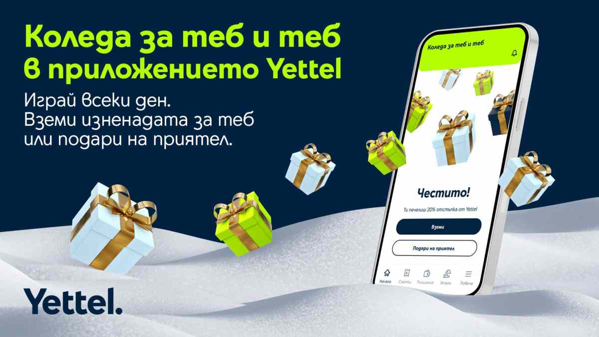 Този декември всички потребители на мобилното приложение на Yettel ги очакват 31 празнични дни, пълни с усмивки и страхотни изненади. Всеки ден от месеца те ще имат възможност да отключват по една дата от специалния коледен календар в приложението и ще получават изненади от оператора и неговите партньори. За да стигнат до празничните оферти, потребителите трябва да влязат в мобилното приложение и да намерят банера „Коледа за теб и теб“. Той ще ги отведе до календара, който помага желаните подаръци да станат реалност. И понеже Коледа е, за да подаряваш, всеки може да ползва отворената за деня изненада за себе си или да я сподели с близък в мрежата на телекома.