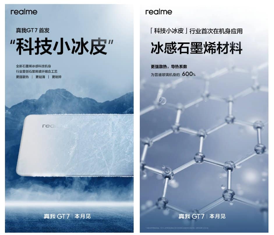 Повечето устройства и флагмани, фокусирани върху производителността (поне от Китай), използват все по-големи VC охлаждащи плочи, които са прикрепени към SoC. Топлината, абсорбирана от VC плочата, обаче също трябва да се разсейва в околната среда, поради което нито предната, нито задната част функционират като добър проводник на топлина. Производителите експериментираха с метални задни плочи, но те имаха своите проблеми. Сега, като се има предвид, че твърдението на Realme по отношение на 600% по-висока топлопроводимост е вярно, това ще е от полза за устойчивата производителност на GT7. Съобщава се също, че този нов материал на задната пластина е по-тънък, по-лек и по-устойчив на падане.