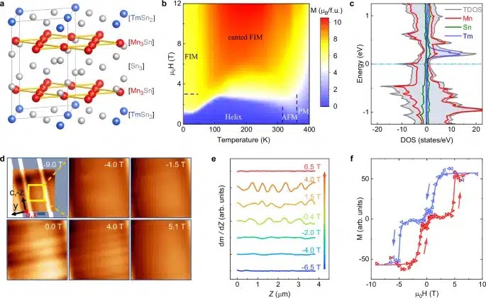 Но създаването на такива структури изисква висока прецизност: необходими са идеално плоски повърхности на атомно ниво, методи за разпрашаване или фино ръчно сглобяване на отделните слоеве. Всичко това е скъпо, сложно и слабо мащабируемо. Екип, ръководен от професор Цю Же от Института по физически науки в Хефей, предлага да се справи без всичко това, като използва магнитен материал с необичайна структура – TmMn₆Sn₆. Той принадлежи към т.нар. кагоме-хелимагнетици: това са специални кристали, в които атомите образуват шарка, подобна на японска плетена кошница (оттам и името „кагоме“).