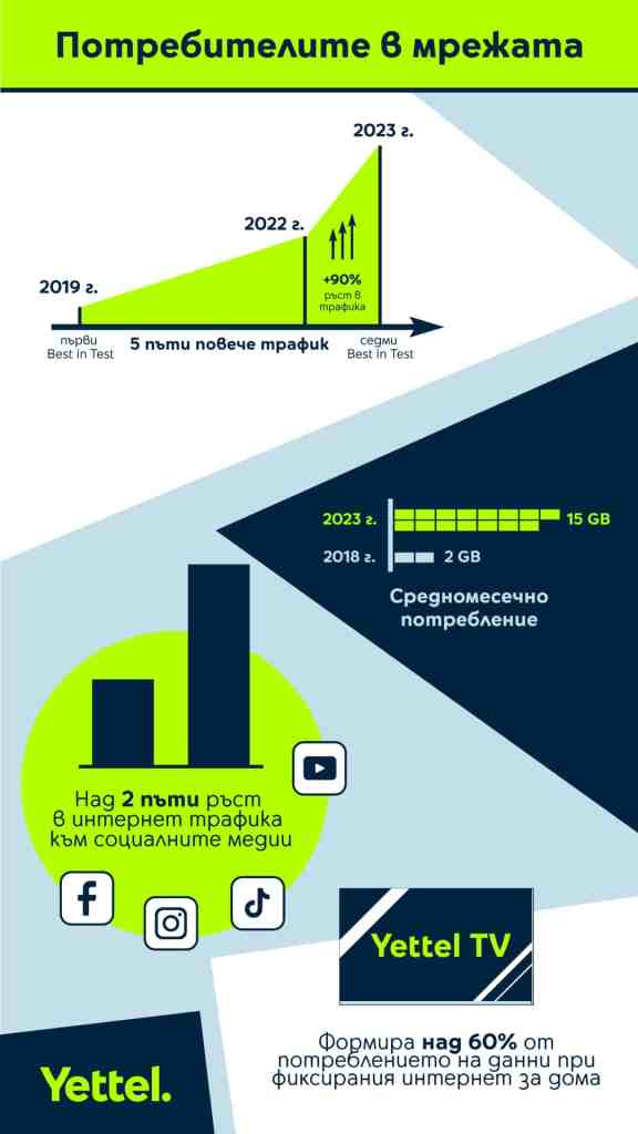 Сериозен принос за това имат и приложенията за комуникация и социалните медии като TikTok, YouTube, Facebook, Instagram, Viber и други. През 2023 г. ръстът на трафика, генериран от тях, е повече от два пъти в сравнение с 2022 г. По данни на оператора, клиентите на мобилни услуги най-често използват мрежата именно за да прекарват време в социалните мрежи, да сърфират в интернет или да гледат Yettel TV през мобилно устройство.