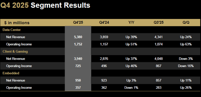 За цялата 2025 година, клиентският и гейминг бизнес на AMD демонстрира ръст на приходите от 51% до рекордните 10,6 милиарда долара. Това беше постигнато не само чрез увеличаване на дела на по-скъпите продукти във веригата за доставки, но и чрез укрепване на пазарната позиция на AMD. За годината гейм бизнесът на AMD демонстрира ръст на приходите от 51% до 3,9 милиарда долара, воден не само от гейминг конзолите, но и от графичните карти Radeon.