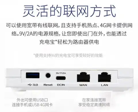 ASUS RT-AX57 Go може да използва като източник на захранване зарядно устройство за смартфон (USB Type-C, 9V/2A) или подобна захранваща банка. В последния случай можете да инсталирате SIM карта с поддръжката на LTE мрежа в рутера, за да го превърнете в мобилна точка за достъп.