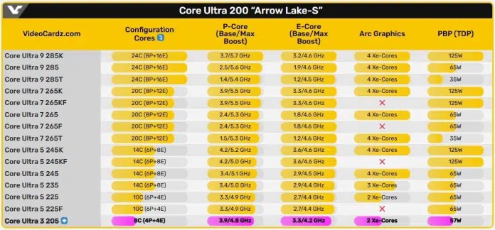 Продуктовата страница потвърждава съвместимостта с новия сокет LGA-1851 и базовата честота от 3.8 GHz. Според изтеклата вътрешна документация на Intel и публикациите на южнокорейския маркетплейс Danawa, Core Ultra 3 205 ще има 8 ядра и конфигурация от типа 4P+4E (четири производителни ядра + четири енергоефективни). Това е минималната конфигурация сред новата линия Arrow Lake и по същество е отправна точка за потребителите, които искат да изпробват платформата LGA-1851, без да плащат прекалено много за допълнителна производителност.