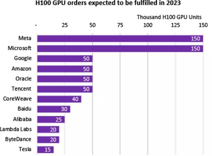 Изданието Tom’s Hardware Guide съобщи, че експертите на Omdia очакват NVIDIA да достави поне 650 000 ускорителя H100 и A100 на своите клиенти до края на тази година. Статистиката включва основно доставчиците на облачни услуги, като най-големите клиенти на компанията в тази област трябва да са Meta и Microsoft, всеки от които се бори за по 150 000 NVIDIA ускорителя.