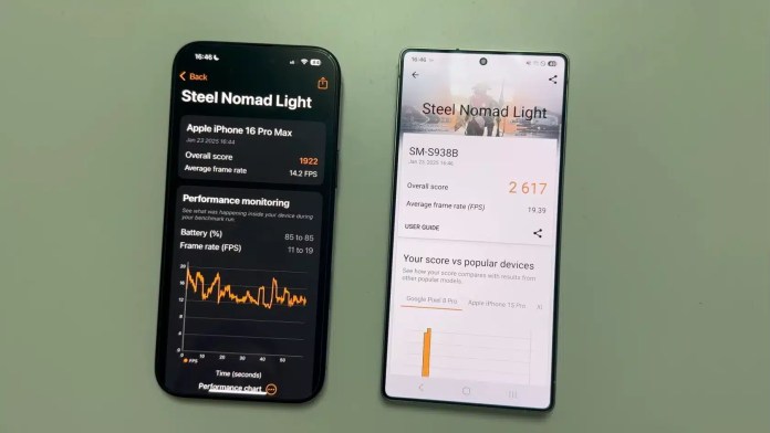 Южнокорейският нов продукт събра 2617 точки, което е с 36% повече от резултата, демонстриран от iPhone 16 Pro Max. Последният е успял да набере само 1922 точки. По отношение на скоростта на кадрите, Galaxy S25 Ultra има средна скорост от 19,39 кадъра в секунда, докато iPhone 16 Pro Max е средно с около 14,2 кадъра в секунда. Това доказва, че Samsung превъзхожда Apple в този конкретен тест. Но, както вече споменахме, това е тест без трасировка на лъчите.