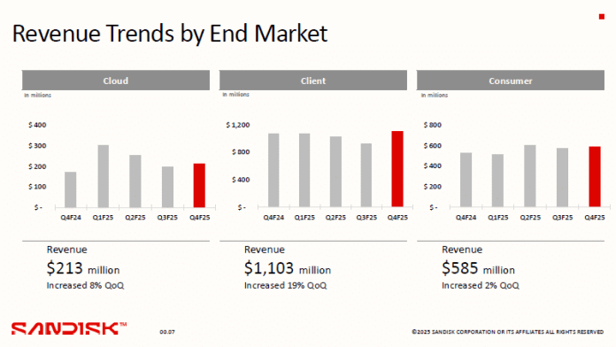 Структурата на приходите на SanDisk е такава, че компанията е повече от наполовина зависима от клиентския сегмент, където е спечелила 1,1 милиарда долара през последното тримесечие, но приходите в тази област са се повишили последователно с 19%. Това се дължи до голяма степен на подготовката на пазара на персоналните компютри за края на поддръжката на Windows 10 и съпътстващия го растеж в търсенето. Пазарът на смартфоните и нарастващата популярност на персоналните компютри с локална поддръжка на AI ускорение обаче също допринесоха за положителната динамика на приходите. В сегмента на потребителската електроника приходите са се повишили последователно с 2% до 585 милиона долара.