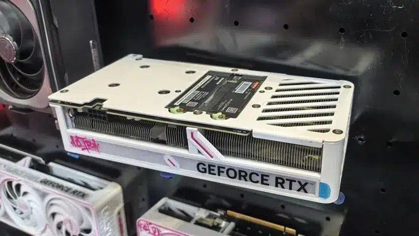 Точното име на модела не е разкрито. Известно е само, че тази бяла видеокарта има охладителна система с два вентилатора, а задната плоча има изрези за инсталиране на два M.2 SSD диска. Този подход позволява ефективното разширяване на общия капацитет за съхранение на системата директно чрез видеокартата. Това може да бъде полезно, ако M.2 слотовете на дънната платка вече са заети от устройства.