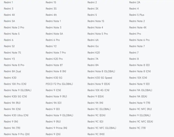 Redmi има най-много устройства, които са загубили поддръжка: новият в списъка Redmi 30S Ultra (CN), както и Redmi Note 9 Pro (ZA), Redmi 9 (ZA) и Redmi 9C (MX).